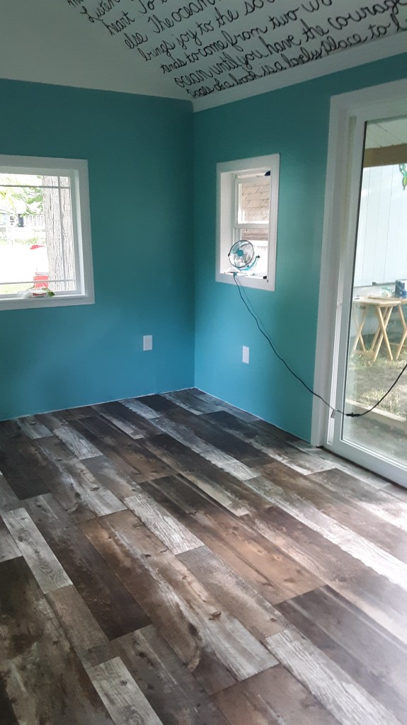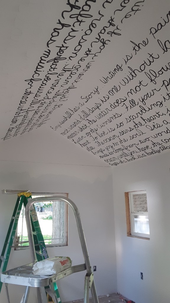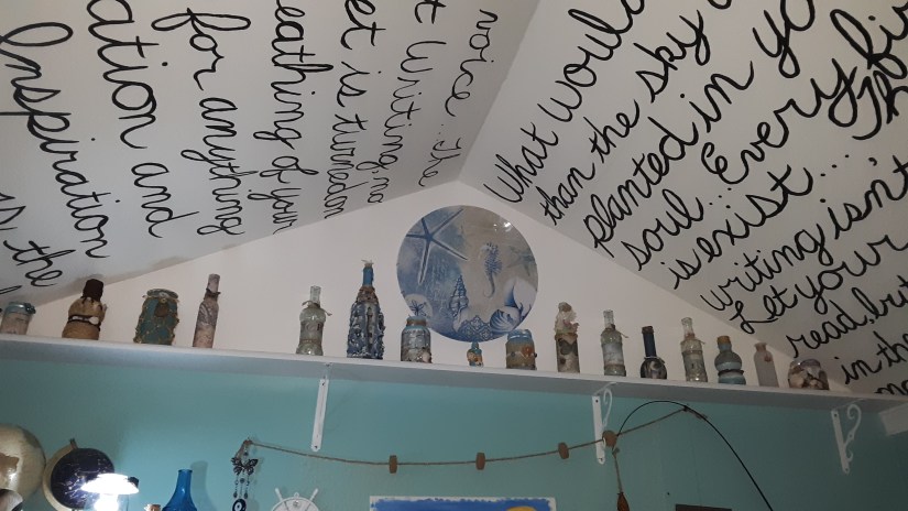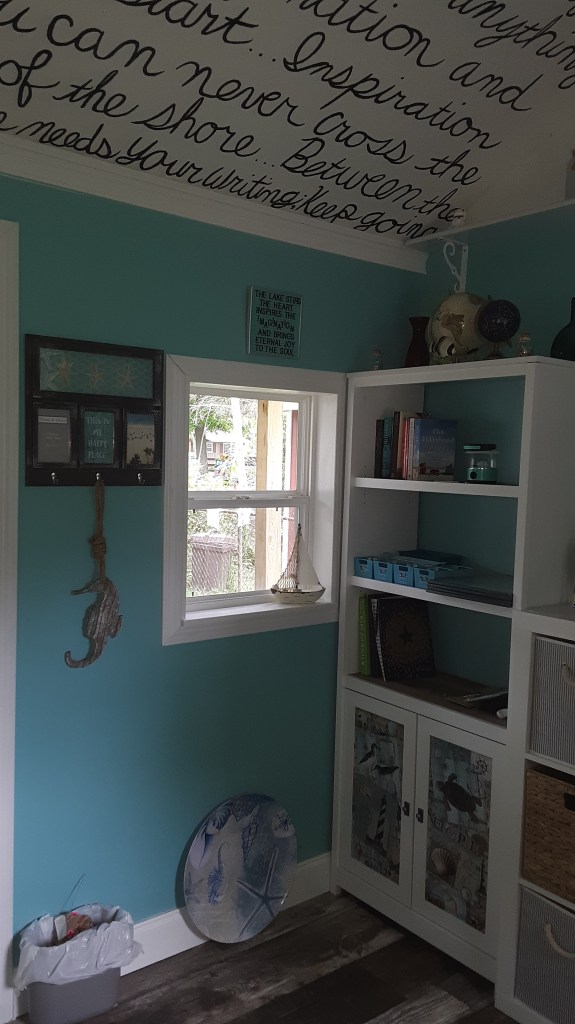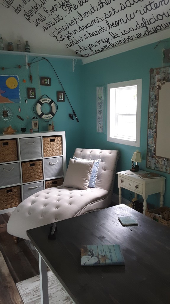 Have a gander at the photos. You may notice that photography is missing in frames hanging on the walls, that there are no filing cabinets, that maybe a floor lamp would complete the corner by the lounger, or that the front porch isn’t quite done, yet. That’s all okay. Time will fill up my space as my writings become more prominent. The porch, along with my private garden, is next year’s project. Therefore, I have plenty of time to add more inspiration to my writing studio.