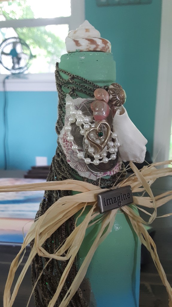It was a leap of faith that I was eager to take, and I trusted she would create something so beautiful and rare just for me. With that thought, I grabbed trinkets and baubles and anything I could find that meant something to me that she could use in the process. She created test bottles that I fell in love with immediately and took home upon her wish. The remaining bottles were more than I had hoped for. My hope is that she continues her mixed media art on various mediums and sells it on the market. The world needs her creations.