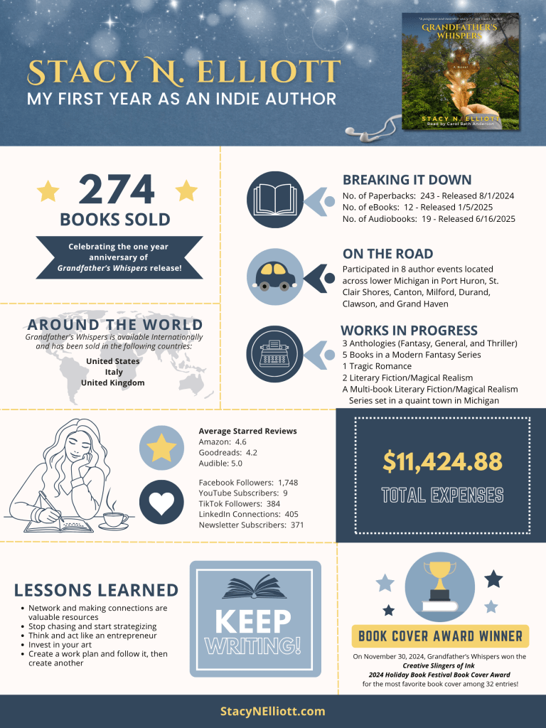 It has been 1 whole year since my debut novel, Grandfather’s Whispers, was released. Since then, I have had it published in paperback, e-book, and audiobook. It can now be ordered online, found in select bookstores and libraries, or ordered directly from me either online or in-person at various events.